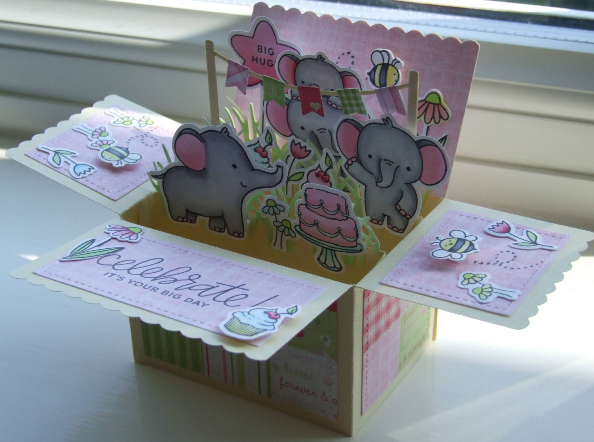 Dies: Lawn Fawn - Scalloped Box Card Pop-Up; Pretty Pink Posh - Bee Friends; My Favorite Things - Adorable Elephants; My Favorite Things - Sending Sweet Celebration Wishes (cakes); Pretty Pink Posh - Elephant Friends; Impression Obsession - Grass Border